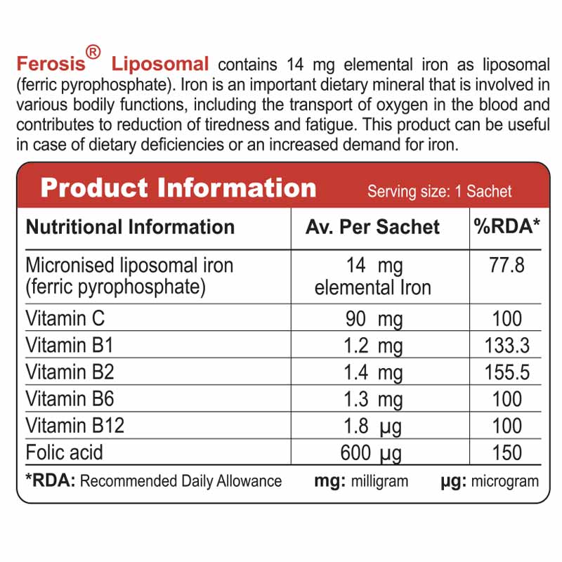 حاوی 14 میلی گرم آهن المنتال و قابل جذب به فرم لیپوزومال و به همراه فولیک اسید و ویتامین های C, B1, B2 ,B6 ,B12  باطعم خوشایند میوه بلک کارنت