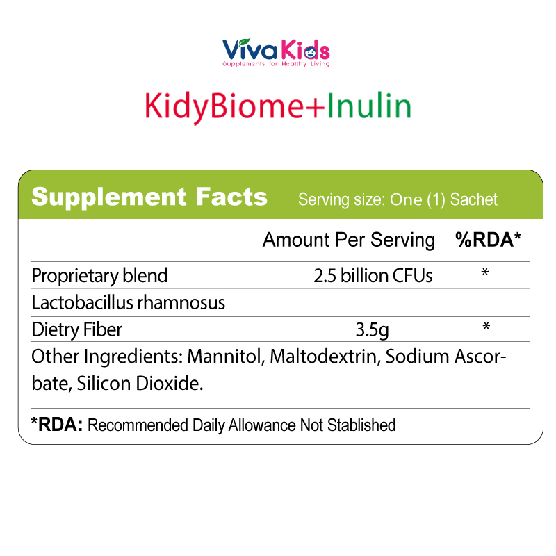 ساشه کیدی بیوم پلاس ایـنولین ویواکیدز حاوی ترکیبی منحصربفرد از مواد طبیعی است که فقط برای سیستم گوارشی کودکان ساخته شده است. این محصول حاوی حداقل 2.5 میلیارد ارگانیسم زنده از سویه لاکتوباسیلوس رامنوسوس است که به عنوان کلونیزه کننده دستگاه گوارش به اضافه اینولین شناخته شده است تا به تنظیم عملکرد دستگاه گوارش کمک کند.