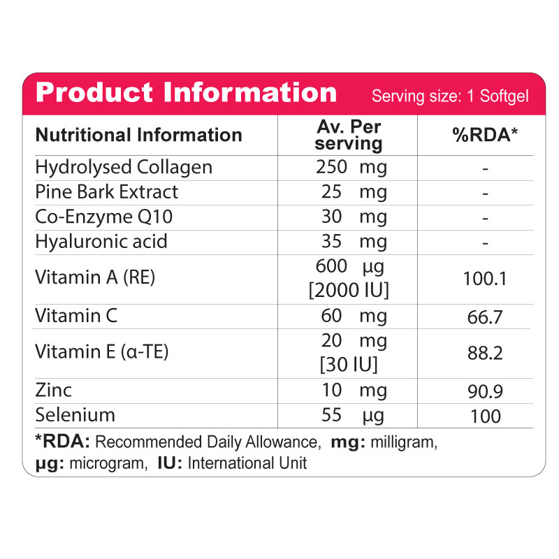 مـکمل غـذایی شامل، ویـتامین، میـنرال، کـلاژن هیدرولیز شده، هیالورونیک اسید، کوآنزیم کیوتن، و عصاره پوست درخت کاج