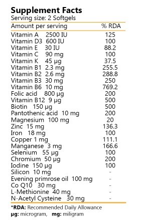 Soybean oil, Magnesium (as Magnesium oxide), Evening primrose, Vitamin C (as Ascorbic Acid), L-Methionine, Vitamin B3 (as Niacinamide), Coenzyme Q10 (Ubidecarenone), N-Acetyl-L-Cysteine, Vitamin E (as D-Alpha Tocopherol), Iron (as Ferrous Fumarate), Zinc (as Zinc Oxide), Vitamin B6 (as Pyridoxine HCl), Vitamin B5 (as D-Calcium Pantothenate), Silica, Lubricant: Soy Lecithin, Manganese (as Manganese sulfate monohydrate), Vitamin B2 (as Riboflavin), Suspending Agent: Bee's wax, Vitamin B1 (as Thiamine Mononitrate), Vitamin A (as Palmitate), Copper (as Copper Oxide), Folic Acid, Biotin, Iodine (as Potassium Iodine), Selenium (as Selenium yeast), Chromium (as Chromium Picolinate), Vitamin K2 (MENAQ7™ Menaquinone MK-7), Vitamin D3 (as Cholecalciferol), Vitamin B12 (as Cyanocobalamin), Softgel shell [Gelatin, Plasticizer/Humectant: Glycerin, Colour: Caramel Colour/ Titanium Dioxide and Purified water