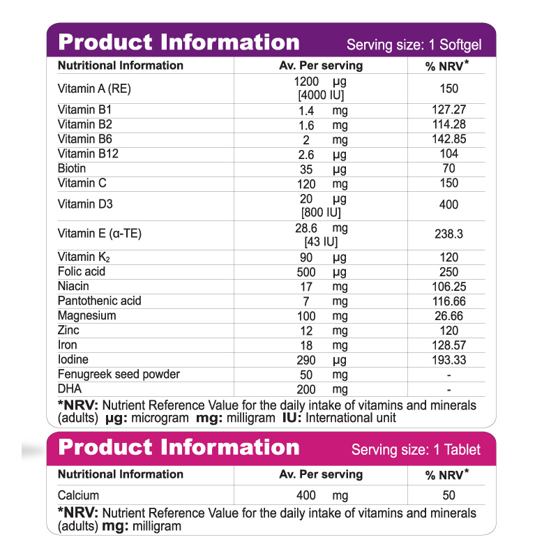 مکمل تغذیه ای حاوی ریز مغزی های ضروری، انواع ویتامین، مینرال، DHA به همراه گیاه شنبلیله ، همراه با قرص کلسیم