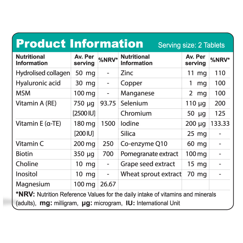 حاوی ترکیب منحصر به فرد شامل انواع ویتامین ها، مواد معدنی، ترکیبات گیاهی، کلاژن هیدرولیز شده و کوآنزیم کیوتن