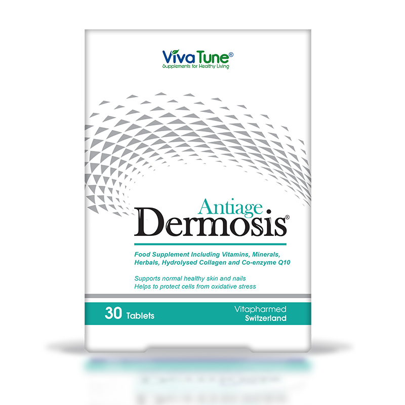 قرص درموسیس آنتی ایج ویواتیون حاوی کلاژن و هیالورونیک اسید به عنوان اجزا حیاتی ساختار بافت همبند، در ترکیب با عصاره هسته انگور، ویتامین ها و مواد معدنی ضروری است که فرمول منحصر به فرد جهت حمایت از پوست، مو و ناخن فراهم می نماید. ویتامین A و روی در حفظ نرمال پوست نقش دارد. ویتامین C همچنین به تشکیل طبیعی کلاژن برای عملکرد طبیعی پوست کمک می کند. روی و سلنیوم به حفظ نرمال مو و ناخن ها کمک می کند. علاوه بر این، سلنیوم، روی، ویتامین C و ویتامینE در حفاظت از سلول ها در برابر استرس اکسیداتیو کمک می کند. در کل این مکمل حاوی آنتی اکسیدان هایی است که با استرس اکسیداتیو مقابله کرده و موجب بهبود عملکردهای سلولی و سلامت کلی بدن می شود.