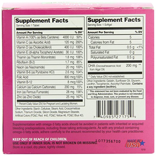 هرجعبه حاوی یک بسته مولتی ویتامین پریناتال + یک بسته DHA (دکوزاهگزانوئیک اسید) گیاهی می باشد. که باعث تکامل سیستم عصبی و بینایی جنین می گردد.