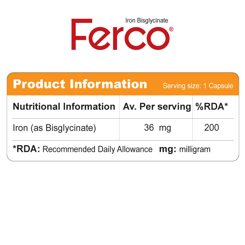 فرکو مکمل تغذیه ای حاوی36 میلی گرم آهن المنتال با ملح بیس گلیسینات در هر کپسول می باشد، آهن، جزء موادمعدنی حیاتی در تشکیل نرمال گلبول های قرمز خون می باشد. آهن جزء مهم همگلوبین می باشد که حامل اکسیژن به سراسر بدن حمل می باشد. این فراورده منجر به کاهش خستگی، سلامت عمومی، عملکرد نرمال شناختی، آزادسازی انرژی و عملکرد صحیح سیستم ایمنی می گردد. آهن همچنین در تقسیم سلولی نقش دارد.