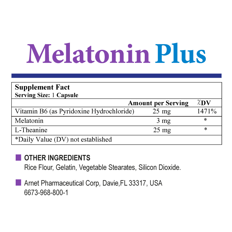 این مکمل حاوی، ملاتونین، ال تیانین و ویتامین B6 می باشد. ویتامین B6 به بیوسنتز ملاتونین کمک، و کمبود آن می تواند به مشکلات خواب منتهی شود. ال تیانین موجود در مکمل ملاتونین پلاس، کیفیت خواب فرد را افزایش می دهد و تعداد دفعاتی که فرد در طول خواب شبانه می پرد را کاهش می دهد. از طرفی، ال تیانین کمک می کند تا فرد سریعتر بخوابد.