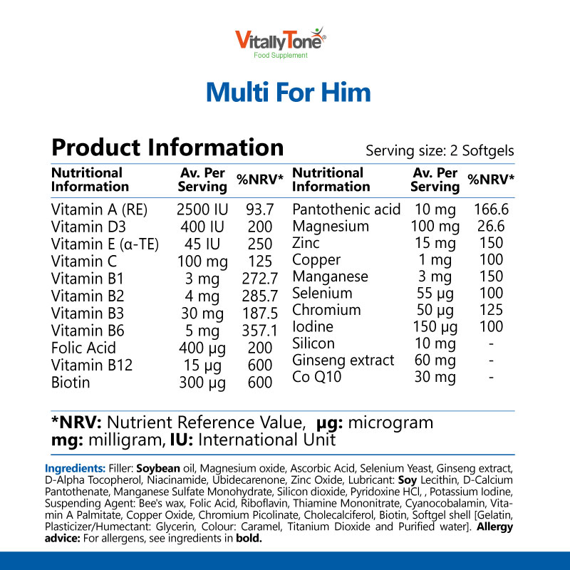 سافت ژل مولتی فورهیم ویتالی تون  از برند ویتالی تون،  مکمل تغذیه ای مختص آقایان، حاوی انواع ویتامین ها و مواد معدنی به همراه کوانزیم کیوتن و عصاره گیاه جینسنگ جهت تامین نیازهای روزانه و افزایش انرژی می باشد.