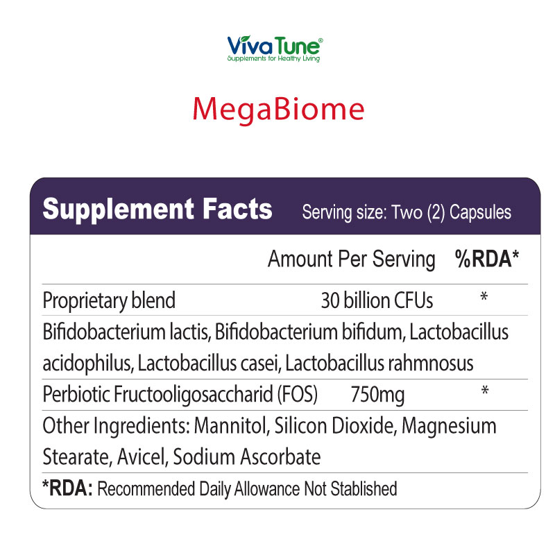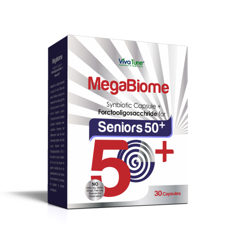 کپسول پروبیوتیک مگابیوم ویواتیون به صورت اختصاصی برای بزرگسالان 50 سال به بالا فرموله شده است و حاوی 30 میلیارد سلول زنده از 5 سویه است تا فلور روده را تکمیل کند. این محصول پروبیوتیک شامل لاکتوباسیلوس اسیدوفیلوس، لاکتوباسیلوس کازئی، لاکتوباسیلوس رامنوسوس و بیفیدوباکتریوم لاکتیس است که به طور هماهنگ با هم کار می کنند و به حمایت از سلامت دستگاه گوارش کمک می کنند. فروکتولیگوساکاریدها (FOS) موجود در این محصول نوعی پری بیوتیک هستند که با افزایش تعداد میکروارگانیسم های محافظ می توانند رشد فلور مفید در دستگاه گوارش را بهبود دهند و به عملکرد سیستم ایمنی کمک کنند.